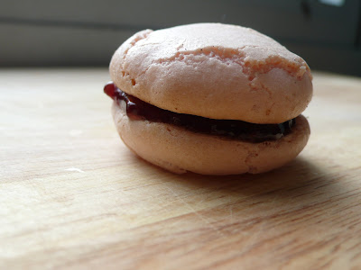 These raspberry macaroons look far better than they tasted. I love a good macaron, and this is not one of them. The recipe called for the delicate little cookies to be filled with store bought raspberry jam. I knew up front that that couldn't be a formula for success, and I had the best intentions of making my own raspberry filling. I had the ingredients in hand but at the critical moment -- which had to have been about 11 PM on Wednesday night -- I wimped out. All the talk of food mills and pectin and candy thermometers was too much for me. I used store bought jam instead, and the final product turned out sickly-sweet and only weakly reminiscent of raspberries.